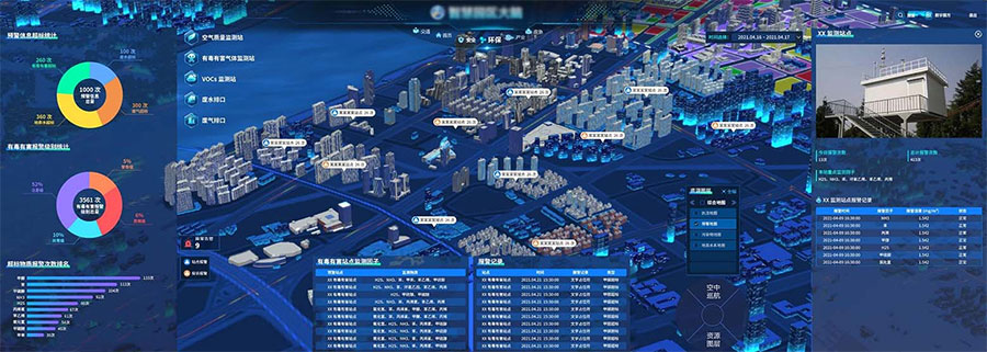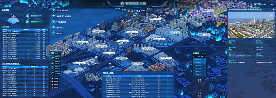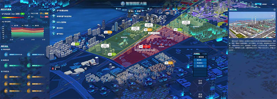 基于GIS、3D等技术建立立体环境监管体系,包括园区一张图、监测预警一张图、环境执法一张图、污染源企业一张图、应急资源一张图,以环境保护为目标多平台构建系统,打好水气危废污染防治攻坚战,建设全面、领先的现代化智慧化工园区。